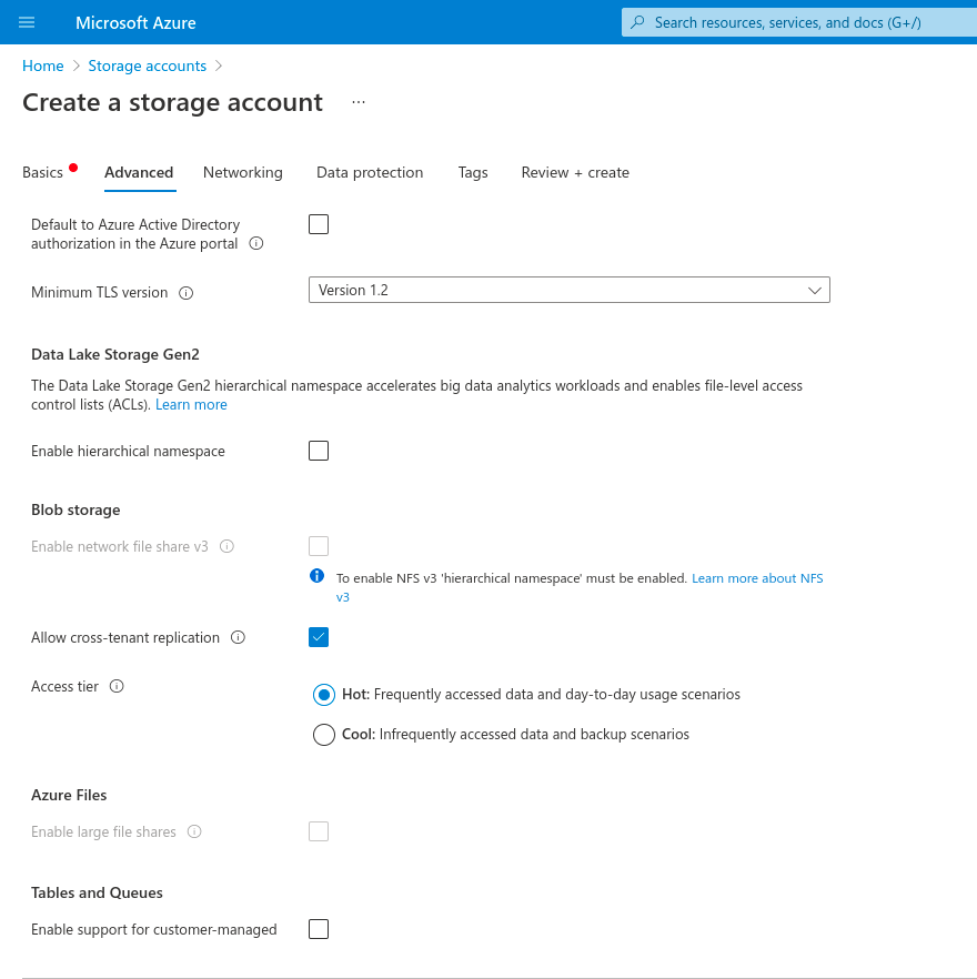 In the Advanced tab you can change security settings. Access tier is used to define how often you will be accessing the data in the account. For applications which will be connecting to the storage account you should select Hot. Cool is used for situations where you want to store data or files in the cloud but you won’t be using them and are keeping them for archive purposes or as a backup.
