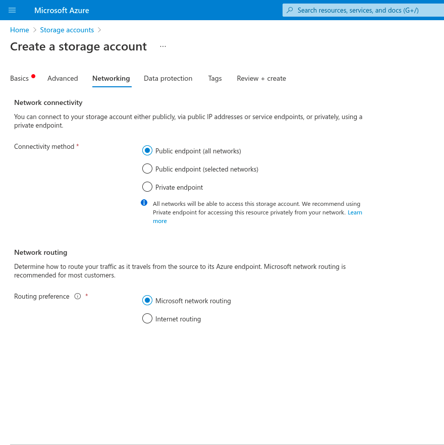 The Networking tab describes how you and other will be connecting and accessing the storage account. Here you can connect with other Microsoft Azure services like Private endpoints and Virtual Networks.
