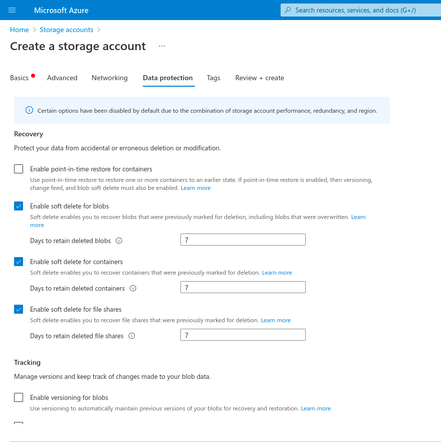 In the Data protection tab you can set things like soft deletes and your retention policy for files and data.