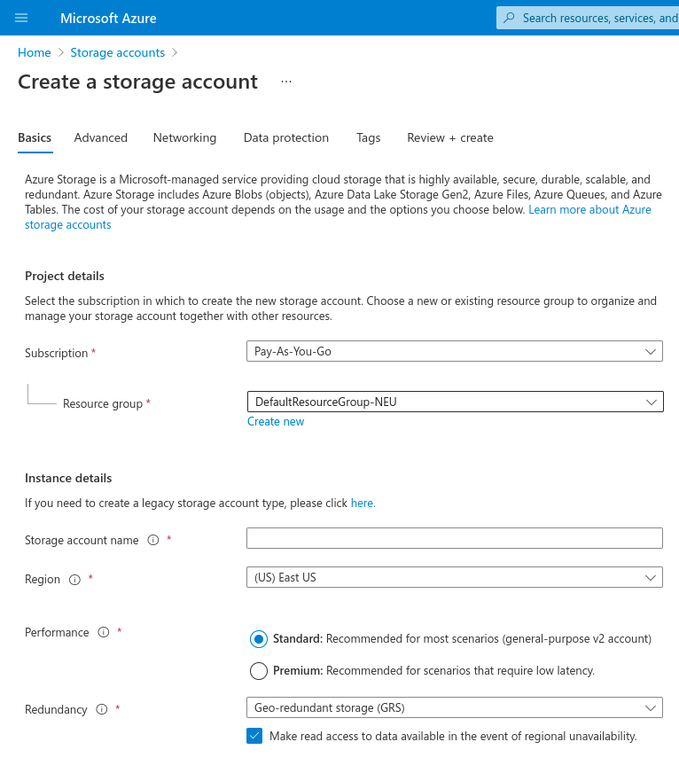 The important fields here are performance and Redundancy. Most applications should use Standard as this provides very reliable and quick read and write speeds. Premium is for very specific needs that you would most likely know about when setting up your application. Redundancy is what happens to your data should there be an incident at the region where you set up your storage account. This selection defines what the failover process should be. Geo-redundant storage (GRS) is the most common and best choice here.